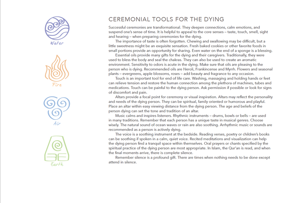 This guidebook presents information about literal, emotional, mythic, energetic, and ceremonial tools. It also suggests various rituals that help to prepare for death as a rite of passage. It is hoped that the personal stories and illustrative quotes will help you expand your imagination as you create your own unique rite of passage.